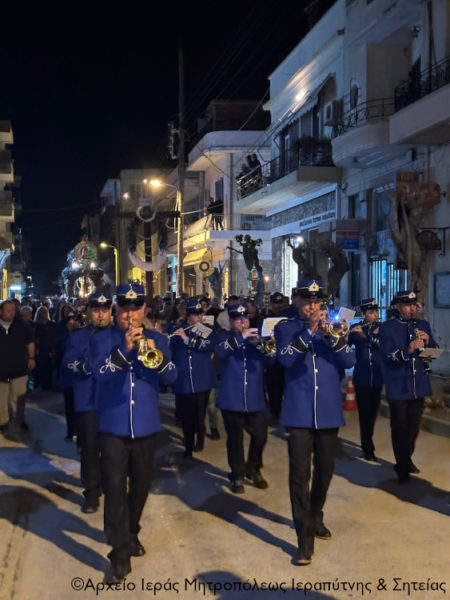 Ακολούθησε η έξοδος και η περιφορά του Επιταφίου και η καθιερωμένη συνάντηση των Επιταφίων των έξι Ιερών Ναών (πέντε Ενοριακών και ενός Προσκυνηματικού) της πόλης της Ιεράπετρας. Την περιφορά του Επιταφίου συνόδευε η Φιλαρμονική Ορχήστρα του Δήμου Ιεράπετρας, η οποία παιάνισε πένθιμα εμβατήρια που είναι συνυφασμένα με τη Μεγάλη Παρασκευή, ενώ πολυμελής χορωδία υπό τη διεύθυνση του Πρωτοψάλτη και Δ/ντή της Σχολής Βυζαντινής Μουσικής της Ιεράς Μητρόπολης κ. Ιωάννη Αρώνη απέδωσε αριστοτεχνικά τα Εγκώμια του Επιταφίου θρήνου.