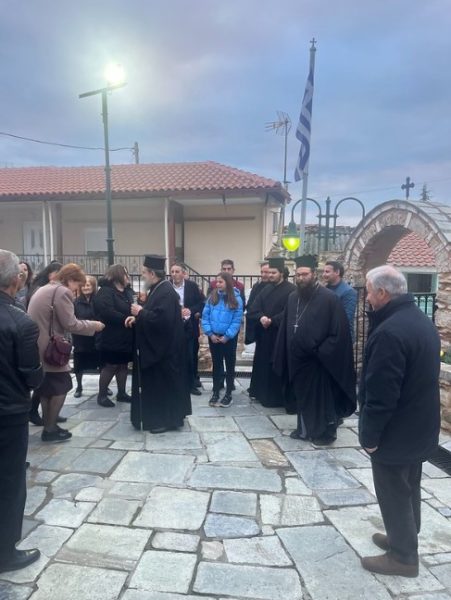 Ακολουθούμενος από τον Διάκονό του π. Νικόδημο Κωτινούδη, ο Σεβασμιώτατος έγινε δεκτός από τους πιστούς της Ενορίας που επικεφαλής τους ήταν ο Εφημέριός του Αιδ. Οικ. π. Αντώνιος Παπασωτηρίου, ο Πρόεδρος του Τοπικού Συμβουλίου κ. Δημήτριος Ντισλής, Τοπικοί Σύμβουλοι κ.ά.