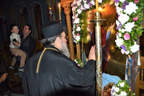 Τοποθετήθηκε εντός του Ναού της Μονής και τελέσθηκε ο Εσπερινός, η Μεγάλη Παράκλησις και ακολούθησε Ιερά Αγρυπνία. Στην μικρή προσλαλιά του ο Σεβασμιώτατος, ανταπαντώντας στην παρουσίαση της Αγίας Εικόνος από τον π. Χρυσόστομο, ευχήθηκε η Παναγία η Χαλκιδικιώτισσα να αποβή το ευήκοο ούς στα αιτήματα των χριστιανών που θα προσκυνούν τη Χάρη Της και επιπλέον η ισχυρά παρηγορία του Λαού μας, καθότι ως Παντάνασσα αποβαίνει η Παράκλησις της Εκκλησίας, δηλαδή, Εκείνη που αποδέχεται τα αιτήματά μας και παρηγορεί παντοιοτρόπος τον ψυχισμό μας.