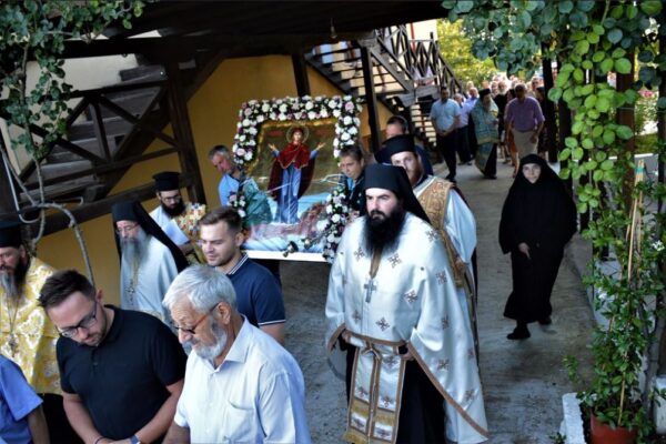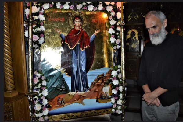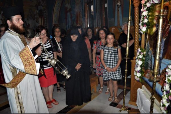 Την εικόνα υποδέχθηκε χθες, Κυριακή 2 Αυγούστου, ο Σεβασμιώτατος Μητροπολίτης Ιερισσού, Αγίου Όρους και Αρδαμερίου κ. Θεόκλητος πλαισιούμενος από τον Πνευματικό της Ιεράς Μονής και Ιεροκήρυκα Παν. Αρχιμ. π. Χρυσόστομο Μαιδώνη, τον Παν. Αρχιμ. π. Παίσιο Σουλτανικά, τον Αιδ. Οικ. π. Κωνσταντίνο Αγούλα, τους Διακόνους π. Κωνσταντίνο Ισαακίδη και π. Θεόκλητο Παρδάλη, τις αδελφές της Ιεράς Μονής, τον Πρόεδρο της Τοπικής Κοινότητος Αρναίας κ. Αγαπητό Κιάτο, την Πρόεδρο της Σχολικής Επιτροπής Πρωτοβαθμίου Εκπαιδεύσεως Δήμου Αριστοτέλη, Ευγενία Γιαννούση, και πλήθος χριστιανών.