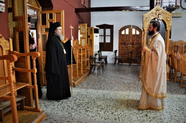 Τον Σεβασμιώτατο υποδέχτηκε ο Εφημέριος της Ενορίας Παν. Αρχιμ. π. Εφραίμ Τσόλης, και ο Αρχιερατικός Επίτροπος της Περιοχής, με τους λιγοστούς Εκκλησιαστικούς Συμβούλους, τους Ιεροψάλτες και τον αναγκαίο αριθμό ενοριτών του, λόγω των απαγορεύσεων περί μη διασποράς της επιδημίας του κορωνοϊού. Οι θύρες του Ναού ήταν κλειστές, τα μεγάφωνα εκτός του Ιερού Ναού ανοιχτά προς μετάδοση του “Χριστός Ανέστη” στον πληγωμένο Λαό του Θεού, ενώ όπως όλες οι Ιερές Ακολουθίες αναμεταδόθηκε με ήχο και εικόνα από την ιστοσελίδα ERGO BLOG ΧΑΛΚΙΔΙΚΗΣ.