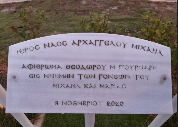 Το νεοανεγερθέν εξωκλήσι του Αρχαγγέλου Μιχαήλ έγινε δαπάνη του ευσεβούς φιλαγίου αειμνήστου Θεοδώρου Πουρνάρη.