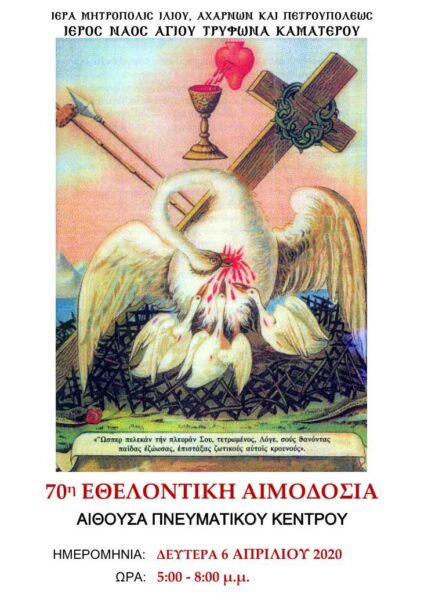Συστρατευμένοι λοιπόν στον αγώνα της κοινωνίας μας, σάς προσκαλούμε τη Δευτέρα 6 Απριλίου 2020, από τις 5 μ.μ έως τις 8 μ.μ. στην 70η εθελοντική αιμοδοσία στο Πνευματικό κέντρο του Ι. Ν. Αγίου Τρύφωνος Καματερού (Τεπελενίου και Αριστείδου γωνία).