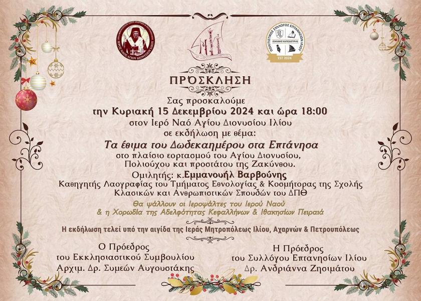 Την Κυριακή 15 Δεκεμβρίου 2024 και ώρα 18:00 στον Ιερό Ναό Αγίου Διονυσίου Ιλίου, σε εκδήλωση με θέμα: «Τα έθιμα του Δωδεκαημέρου στα Επτάνησα», στο πλαίο του εορτασμού του Αγίου Διονυσίου, Πολιούχου και προστάτου της Ζακύνθου. Ομιλητής είναι οι κ. Εμμανουήλ Βαρβούνης, Καθηγητής λαογραφίας του Τμήματος Εθνολογίας και Κοσμήτορας της Σχολής Κλασικών και Ανθρωπιστικών Σπουδών του Δ.Π.Θ.