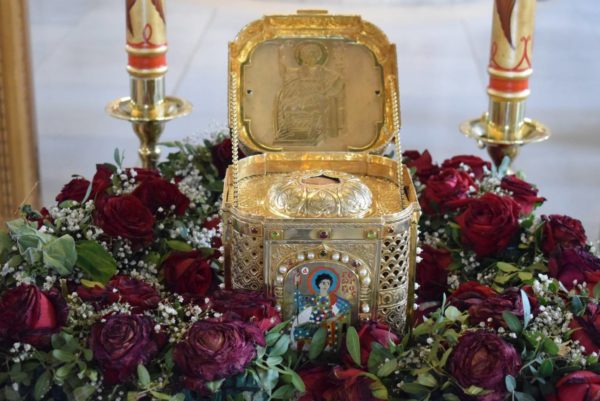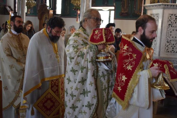 Πριν το τέλος της Θείας Λειτουργίας και αφού τελέστηκε η ακολουθία της αρτοκλασίας και η ευλογία των κολύβων του Αγίου, ο Σεβασμιώτατος αναφέρθηκε στον στίχο του απολυτικίου της Μεσοπεντηκοστής «Μεσούσης τῆς ἑορτῆς, διψῶσάν μου τὴν ψυχήν, εὐσεβείας πότισον νάματα», τονίζοντας ότι τα νάματα που αναφέρονται δεν είναι μόνο τα σωτήρια λόγια του Χριστού και του Ευαγγελίου Του, αλλά και η βίωσή τους μέσω της Θείας Ευχαριστίας, που τροφοδοτεί τον άνθρωπο και τον οδηγεί στη σωτηρία του. Ο Άγιος Γεώργιος, του οποίου τα λείψανα προσκυνούμε, είναι ζωντανή έκφραση αυτής της πραγματικότητας, αφού την επιβεβαίωσε με το μαρτύριό του.
