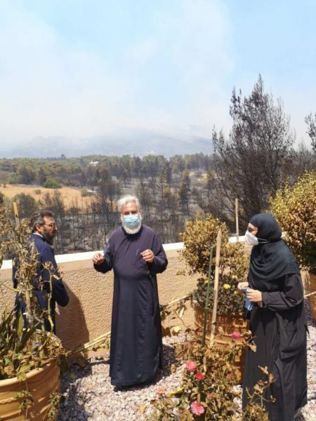 Στη συνέχεια, βρέθηκε στο φυλάκιο της πυροσβεστικής, όπου συνομίλησε με πυροσβέστες και εθελοντές πυροσβέστες που εκείνη την ώρα βρίσκονταν στη βάρδια, τους ευλόγησε και τους ευχαρίστησε θερμά για την μέχρι τώρα προσφορά και το έργο τους.