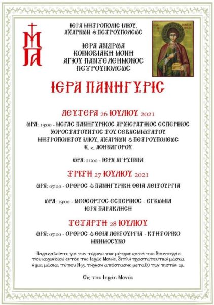 Τη Δευτέρα 26 και την Τρίτη 27 Ιουλίου, η Ιερά Μονή Αγίου Παντελεήμωνος Πετρουπόλεως πανηγυρίζει την εορτή του εφόρου τής Αγίου, σύμφωνα με το ακόλουθο πρόγραμμα: