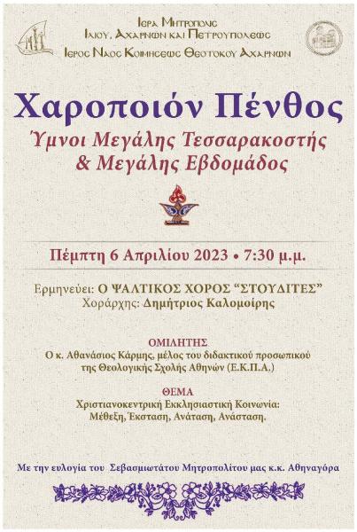 Τα Εκκλησιαστικά Συμβούλια των Ιερών Ναών Αγίου Βλασίου και Κοιμήσεως της Θεοτόκου Αχαρνών, με την ευλογία του Σεβασμιωτάτου Μητροπολίτου Ιλίου, Αχαρνών και Πετρουπόλεως κ. Αθηναγόρα, διοργανώνουν εορταστική εκδήλωση εν όψει της Αγίας και Μεγάλης Εβδομάδας, η οποία θα πραγματοποιηθεί στον Ιερό Ναό Κοιμήσεως Θεοτόκου Αχαρνών, την Πέμπτη 6 Απριλίου 2023 και ώρα 19:30 με τίτλο «Χαροποιόν Πένθος».