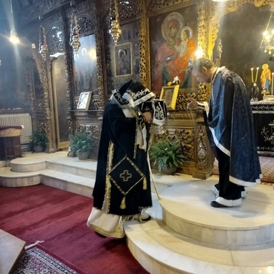 Ο Σεβασμιώτατος χοροστάτησε στην Ακολουθία του Όρθρου, των Ωρών και τέλεσε την Προηγιασμένη Θεία Λειτουργία πλαισιούμενος από τον εφημέριο του Ιερού Ναού.