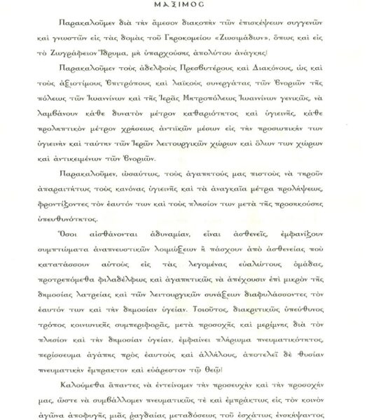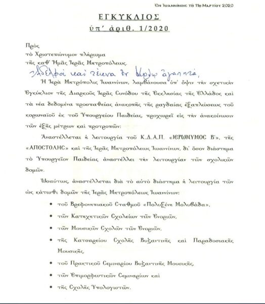 Εγκύκλιος μέτρων πρόληψης του Μητροπολίτη Ιωαννίνων