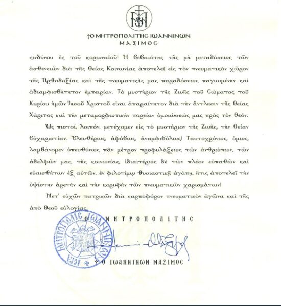 Τέλος τονίζει ο Σεβασμιώτατος ότι: “Η βεβαιότης της μη μεταδόσεως των ασθενειών δια της Θείας Κοινωνίας αποτελεί εις τον πνευματικό χώρο της Ορθοδοξίας και της πνευματικής μας παραδόσεως παγιωμένη και αδιαμφισβήτητον εμπειρία” και παροτρύνει τους πιστούς να “μετέχουμε εις το μυστήριο της Ζωής την Θείαν Ευχαριστίαν ελευθέρως, αφόβως και αναμφιβόλως!”