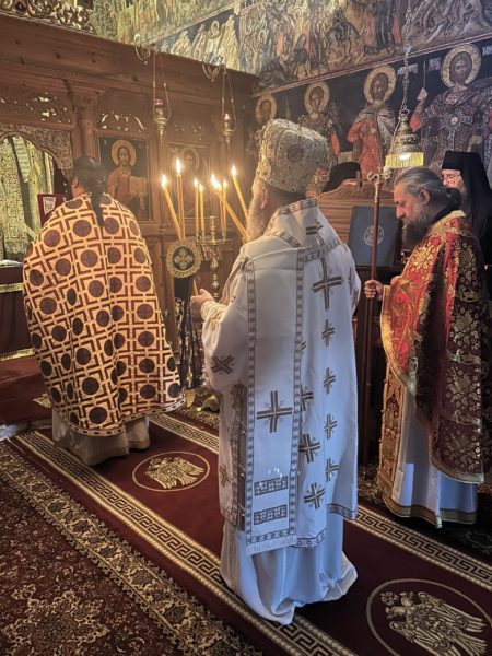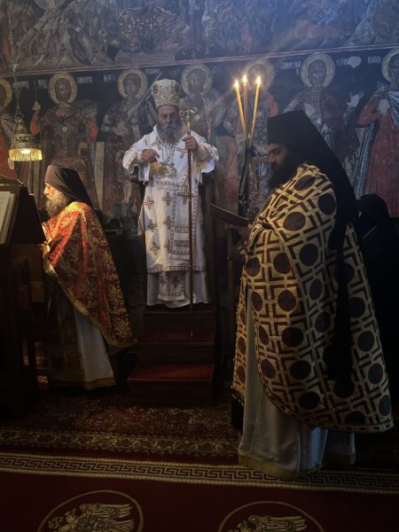 Του Όρθρου χοροστάτησε και προεξήρχε της Θείας Λειτουργίας ο Σεβασμιώτατος Μητροπολίτης Ιωαννίνων κ. Μάξιμος πλαισιούμενος από τον Ηγούμενο της Μονής Ελεούσης καθώς και πατέρες από την Ιερά Μεγίστη Μονή Βατοπαιδίου Αγίου Όρους.