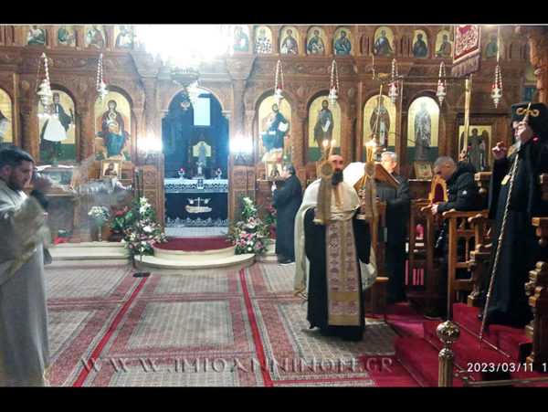 Το απόγευμα, ο Σεβασμιώτατος χοροστάτησε στον Αναστάσιμο Εσπερινό του Σαββάτου στον προαναφερθέντα Ιερό Προσκυνηματικό Ναό.