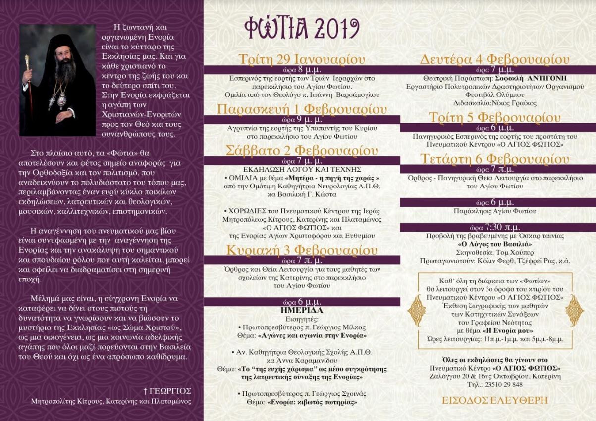 Με αφορμή την έναρξη των εκδηλώσεων ο Σεβασμιώτατος Μητροπολίτης Κίτρους, Κατερίνης και Πλαταμώνος κ. Γεώργιος δήλωσε χαρακτηριστικά: «Η ζωντανή και οργανωμένη Ενορία είναι το κύτταρο της Εκκλησίας μας. Και για κάθε χριστιανό το κέντρο της ζωής του και το δεύτερο σπίτι του. Στην Ενορία εκφράζεται η αγάπη των Χριστιανών-Ενοριτών προς τον Θεό και τους συνανθρώπους τους. Στο πλαίσιο αυτό, τα Φώτια θα αποτελέσουν και φέτος σημείο αναφοράς για την Ορθοδοξία και τον πολιτισμό. H αναγέννηση του πνευματικού μας βίου είναι συνυφασμένη με την αναγέννηση της Ενορίας και την ανακάλυψη του σημαντικού και σπουδαίου ρόλου που αυτή καλείται, μπορεί και οφείλει να διαδραματίσει στη σημερινή εποχή».