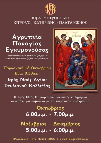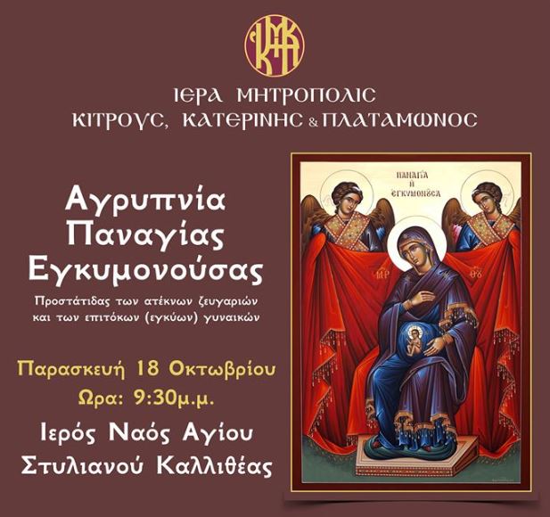 Αγρυπνία Παναγίας Εγκυμονούσας, Προστάτιδος των ατέκνων ζευγαριών και των επιτόκων (εγκύων) γυναικών, θα εκκινήσει κατά την Παρασκευή 18 Οκτωβρίου 2019 και ώρα 9.30 μ.μ. στον Ιερό Ναό Αγίου Στυλιανού Καλλιθέας της Ιεράς Μητροπόλεως Κίτρους, Κατερίνης και Πλαταμώνος.