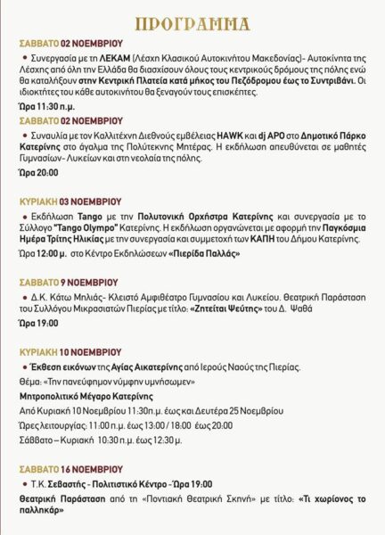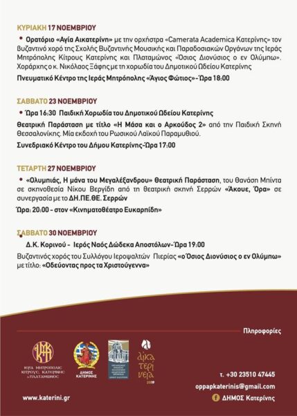 Σε όλη τη διάρκεια του Νοεμβρίου ένας μήνας στην Κατερίνη και για πρώτη φορά & στις Τοπικές Κοινότητες του Δήμου, με εικαστικά, μουσική, θέατρο, λόγο, ένα πλέγμα εκδηλώσεων, οι οποίες αναμένεται να δώσουν ξεχωριστό «χρώμα» στην πολιτιστική ζωή του τόπου.