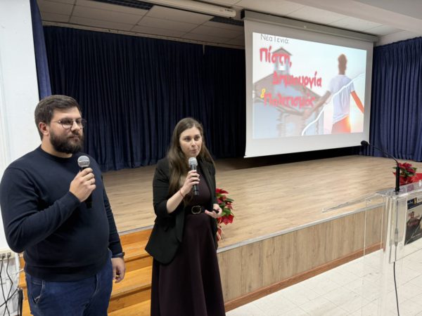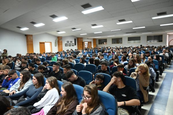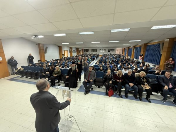 Η συνεδριακή αίθουσα γέμισε από μαθητές των Γυμνασίων της πόλης της Κατερίνης και εκπαιδευτικούς, δημιουργώντας μια ατμόσφαιρα ζωντάνιας και ενδιαφέροντος.