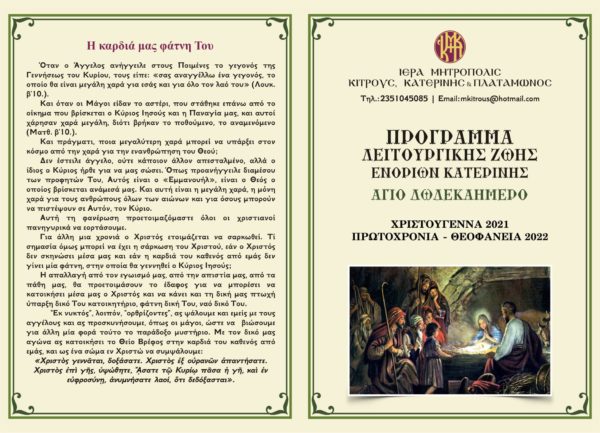 Ενόψει των Χριστουγέννων, η Ιερά Μητρόπολις Κίτρους, Κατερίνης και Πλαταμώνος έχει καταρτίσει ειδικό πρόγραμμα Ιερών Ακολουθιών και Θ. Λειτουργιών.