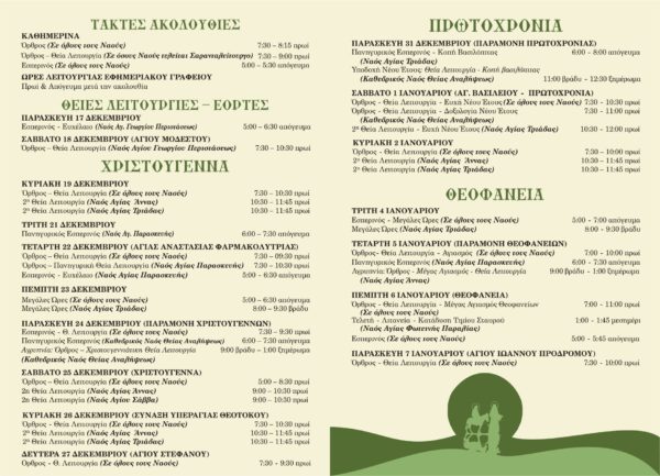 Ανάλογες θα τελεστούν την Πρωτοχρονιά και τα Θεοφάνεια, το πρόγραμμα των οποίων θα ανακοινωθεί προσεχώς.