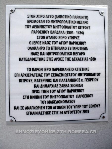 Στον χώρο του δημοτικού πάρκινγκ (γωνία των οδών Παρθενίου Βαρδάκα και Παρμενίωνος) βρισκόταν το Μητροπολιτικό Μέγαρο του αειμνήστου Μητροπολίτου Κίτρους Παρθενίου Βαρδάκα (1904-1934). Στον αύλειο χώρο υπήρχε ο Ιερός Ναός του Αγίου Παρθενίου. Ολόκληρο το κτηριακό συγκρότημα, Ναός και Μητροπολιτικό Μέγαρο, κατεδαφίστηκε στις αρχές της δεκαετίας του 1980.