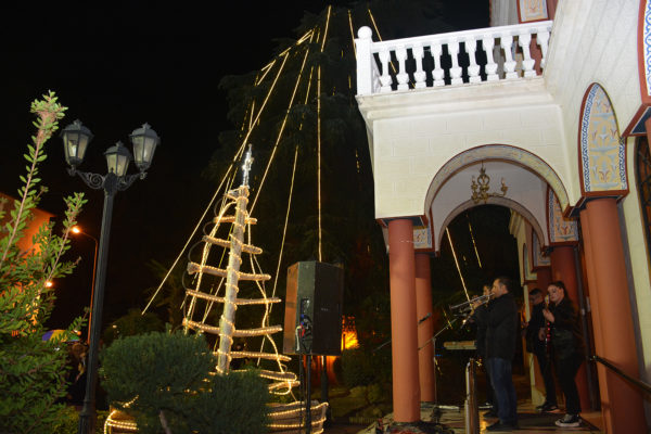 Μετά τον πανηγυρικό Αρχιερατικό Εσπερινό της Πολιούχου Αγίας Αικατερίνης, μπροστά στο Μητροπολιτικό Μέγαρο Κατερίνης, πραγματοποιήθηκε εορταστική Χριστουγεννιάτικη εκδήλωση και φωταγώγηση του φυσικού κέδρου και της φάτνης που βρίσκεται στην αυλή του Μεγάρου.