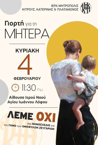Γιορτή για την Μητέρα διοργανώνει η Ιερά Μητρόπολη Κίτρους, την Κυριακή 4 Φεβρουαρίου στις 11:30, στην αίθουσα Ιερού Ναού Αγίου Ιωάννου στον Λόφο Πιερίας.