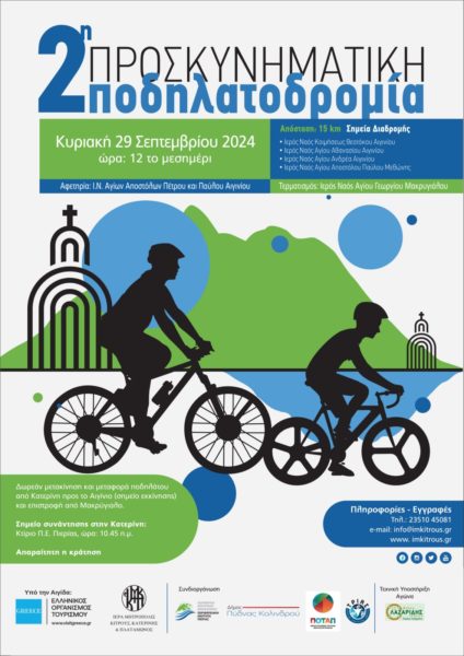 Η 2η Προσκυνηματική Ποδηλατοδρομία θα ξεκινήσει ώρα 12 μεσημέρι της Κυριακής 29 Σεπτεμβρίου από τον Ιερό Ναό Αγίων Αποστόλων Πέτρου και Παύλου Αιγινίου, ενώ η διαδρομή περιλαμβάνει στάσεις στους Ιερούς Ναούς Κοιμήσεως Θεοτόκου, Αγίου Αθανασίου και Αγίου Ανδρέα του Αιγινίου, Αγίου Αποστόλου Παύλου Μεθώνης και τερματισμό στον Ιερό Ναό Αγίου Γεωργίου Μακρυγιάλου.