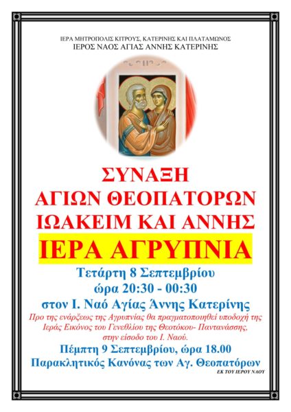 Τη Σύναξη των Αγίων Θεοπατόρων Ιωακείμ και Άννης θα εορτάσει ο Ιερός Ναός Αγίας Άννης Κατερίνης, με Αγρυπνία και υποδοχή της Ιεράς Εικόνος του Γενεθλίου της Θεοτόκου – Παντανάσσης. Η ιερά Αγρυπνία θα ξεκινήσει το βράδυ της Τετάρτη 8 Σεπτεμβρίου, στις 8:30μ.μ.