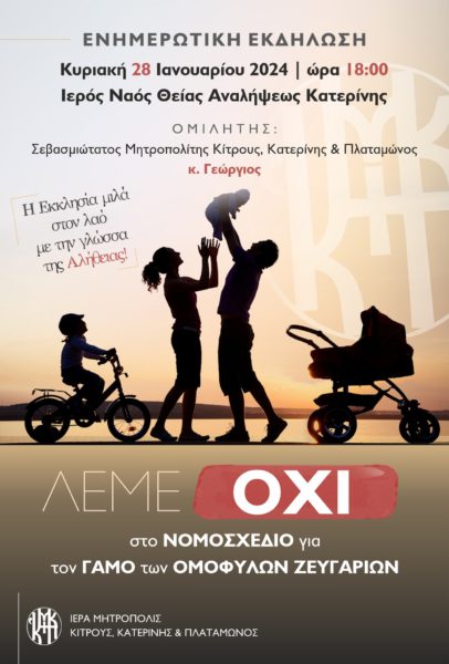 Πολλές ενημερωτικές εκδηλώσεις σε ολόκληρη την Πιερία διοργάνωσε η Ιερά Μητρόπολη Κίτρους, Κατερίνης και Πλαταμώνος, με αφορμή το προωθούμενο νομοσχέδιο που αφορά τον γάμο των ομοφυλόφιλων ζευγαριών και το οποίο αλλοιώνει, φθείρει, υπονομεύει και καταργεί τον ιερό θεσμό του γάμου και της οικογένειας.