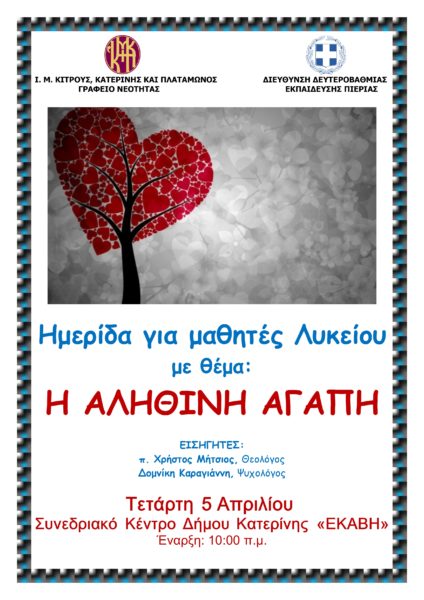 Μια εξαιρετική ευκαιρία είχαν περίπου τριακόσιοι μαθητές Λυκείων της Κατερίνης να συμμετάσχουν την Τετάρτη 5 Απριλίου 2023, στην 3η Ημερίδα Νεότητας με θέμα “Η αληθινή αγάπη”, που πραγματοποιήθηκε στο Συνεδριακό Κέντρο του Δήμου Κατερίνης.