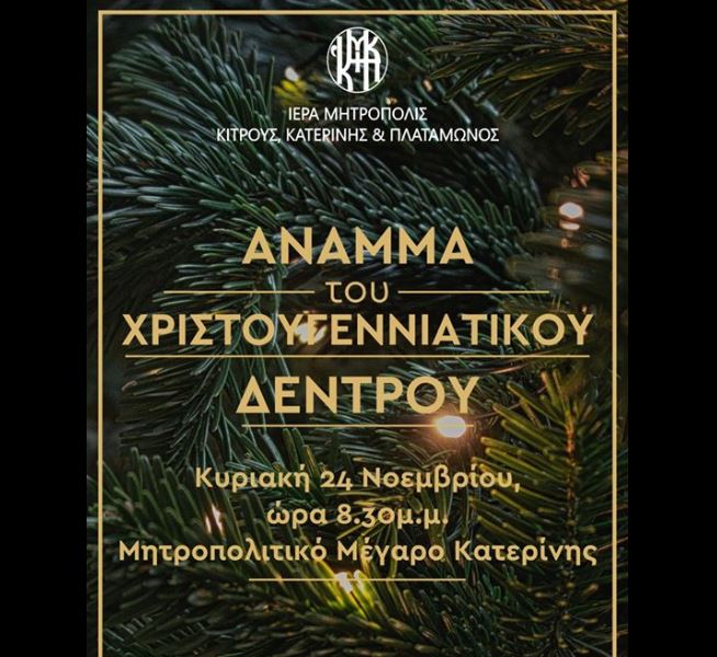 Την Κυριακή 24 Νοεμβρίου, στις 8.30 το βράδυ, μπροστά στο Μητροπολιτικό Μέγαρο, θα πραγματοποιηθεί υπαίθρια χριστουγεννιάτικη εκδήλωση των Κατηχητικών Συνάξεων της Κατερίνης.