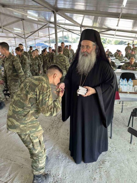 Τον Σεβασμιώτατο υποδέχθηκαν ο Διοικητής του Κέντρου Εκπαίδευσης και ο στρατιωτικός ιερέας π. Σεραφείμ Καλτσουκαλάς. Ακολούθησε αγιασμός, σύντομη ομιλία.