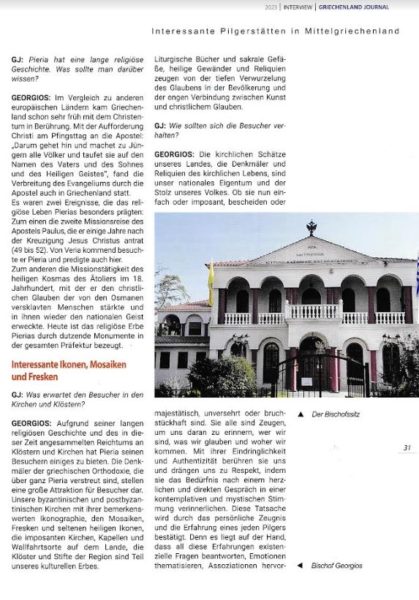 Στις σελίδες του φιλοξενείται συνέντευξη του Σεβασμιωτάτου Μητροπολίτη Κίτρους, Κατερίνης και Πλαταμώνος κ. Γεωργίου. Παράλληλα, η δημοσιογραφική ομάδα του «Griechenland Journal» με επικεφαλής τον δημοσιογράφο κ. Jurgen Weidner πραγματοποίησε ένα οδοιπορικό σε όλη την έκταση της Πιερίας, ανακαλύπτοντας γνωστά και άγνωστα Προσκυνήματα.