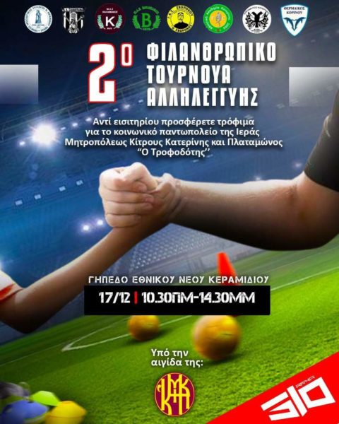 Με κοινό όραμα την αλληλεγγύη και την ανθρωπιά και με την ευλογία και την πατρική μέριμνα του Σεβασμιωτάτου Μητροπολίτη Κίτρους, Κατερίνης και Πλαταμώνος κ. Γεωργίου, πραγματοποιήθηκε την Κυριακή 17 Δεκεμβρίου στο γήπεδο Εθνικού Κεραμιδίου, τουρνουά ποδοσφαίρου για τη συλλογή τροφίμων, εν όψει των Χριστουγέννων, για το Κοινωνικό Παντοπωλείο της Ιεράς Μητροπόλεως «Ο Τροφοδότης».