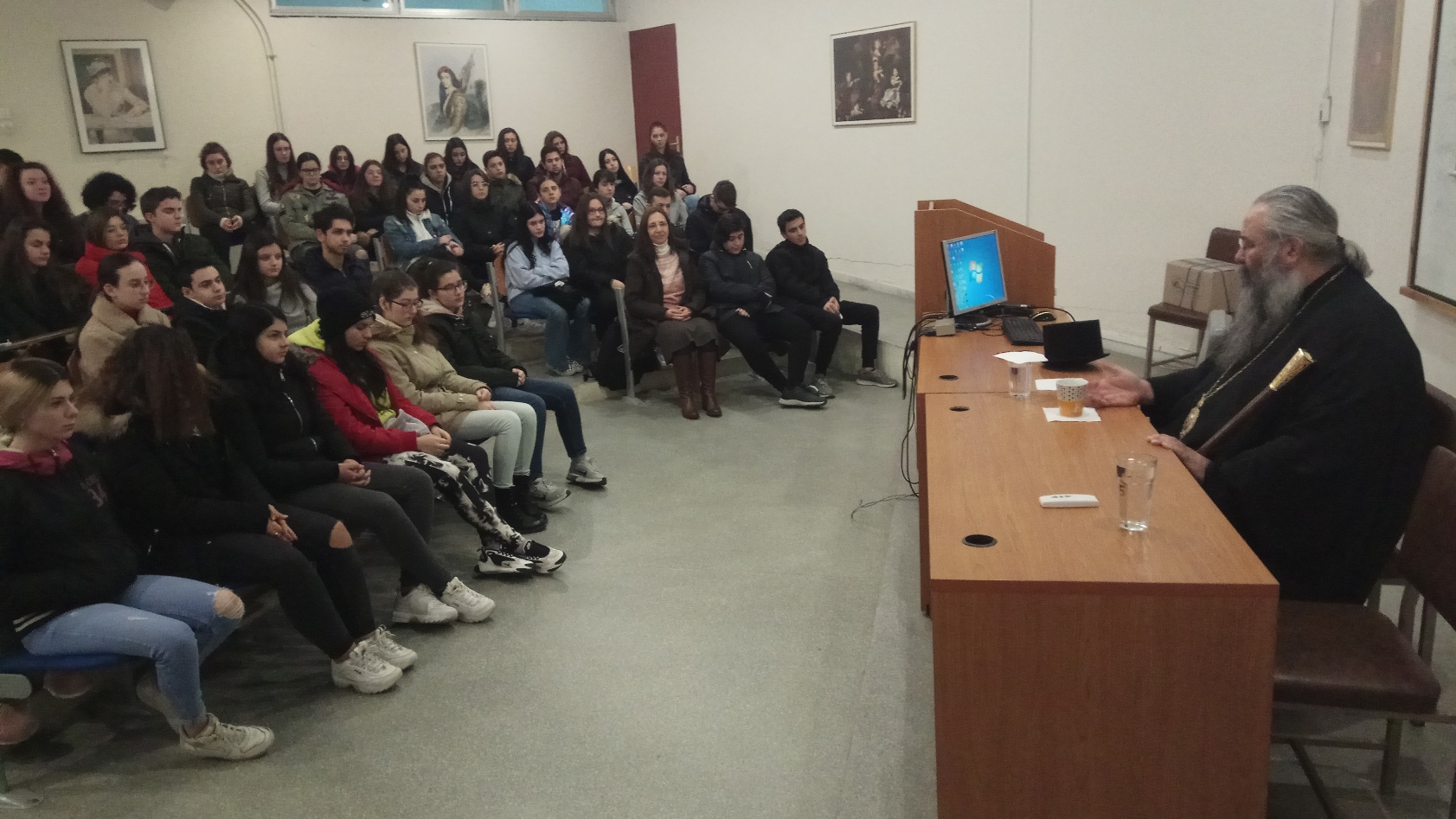 Ο Σεβασμιώτατος συμμετείχε στην πρωινή προσευχή όλων των μαθητών του σχολείου, ευχόμενος καλή και ευλογημένη χρονιά. Στη συνέχεια, στο αμφιθέατρο του σχολείου, είχε συνάντηση με μαθητές της Β΄ Λυκείου με αφορμή την αθρόα συμμετοχή τους στην εις πρεσβύτερο χειροτονία του π. Κωνσταντίνου Κοσμά, ο οποίος υπηρετεί ως φιλόλογος στο σχολείο. Συγκεκριμένα, ο Σεβασμιώτατος εξέφρασε την ευαρέσκειά του για την πολυπληθή συμμετοχή των μελών της σχολικής κοινότητας, καθηγητών και μαθητών, στη χειροτονία, που τελέστηκε στον Ιερό Καθεδρικό Ναό Θείας Αναλήψεως κατά την Αγρυπνία των Χριστουγέννων. Μετά τη μικρή εισαγωγή του Μητροπολίτη, υπήρξε γόνιμος διάλογος με τους μαθητές και μαθήτριες σε διάφορα ζητήματα νεανικού προβληματισμού.