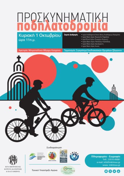 Την Κυριακή 1 Οκτωβρίου και ώρα 11 το πρωί θα πραγματοποιηθεί η πρώτη « ΠΡΟΣΚΥΝΗΜΑΤΙΚΗ ΠΟΔΗΛΑΤΟΔΡΟΜΙΑ» που διοργανώνει η Ιερά Μητρόπολη Κίτρους, Κατερίνης και Πλαταμώνος σε συνεργασία με την Περιφερειακή Ενότητα Πιερίας, τον Δήμο Κατερίνης, τον Πολιτιστικό Οργανισμό του Δήμου Κατερίνης (ΟΠΠΑΠ) και τον Αθλητικό Σύλλογο Τριάθλου «ΤΡΙΑΣ».