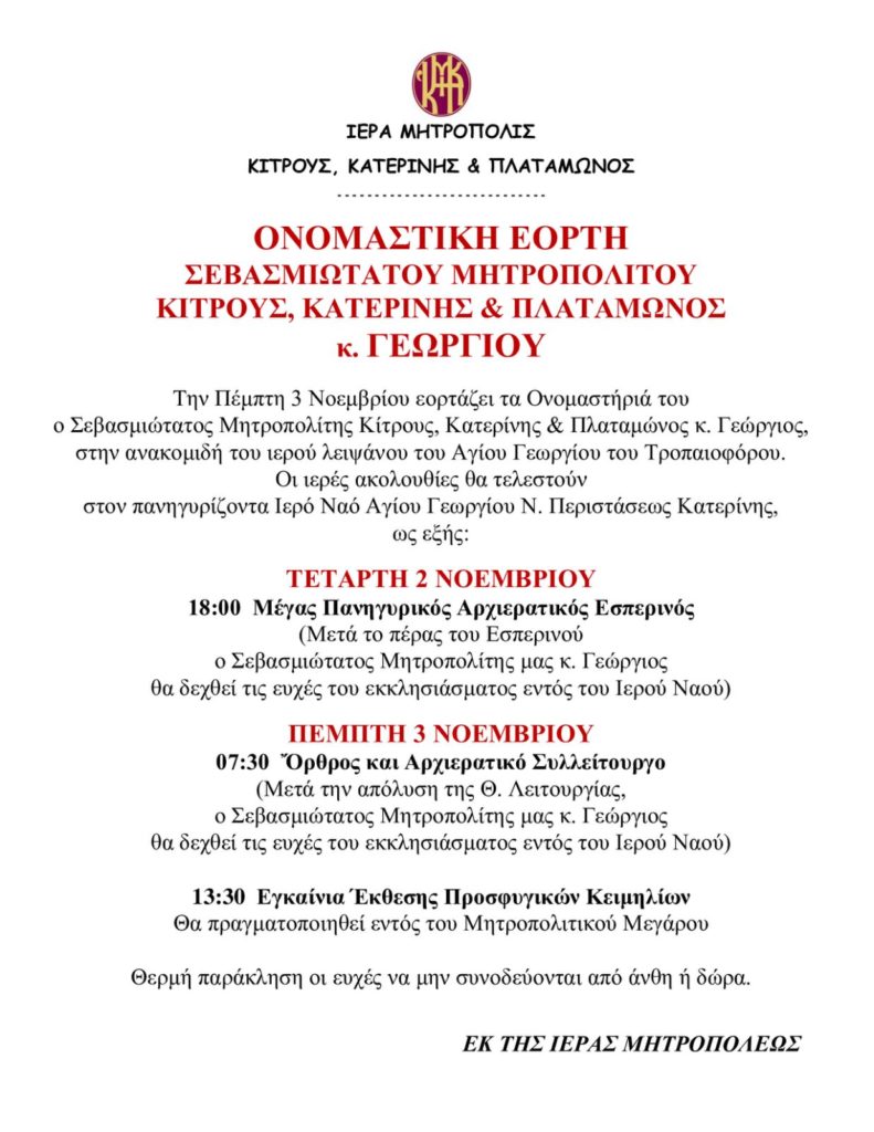 Την Πέμπτη 3 Νοεμβρίου εορτάζει τα ονομαστήριά του ο Σεβασμιώτατος Μητροπολίτης Κίτρους, Κατερίνης και Πλαταμώνος κ. Γεώργιος, στην ανακομιδή του Ιερού Λειψάνου του Αγίου Γεωργίου του Τροπαιοφόρου.