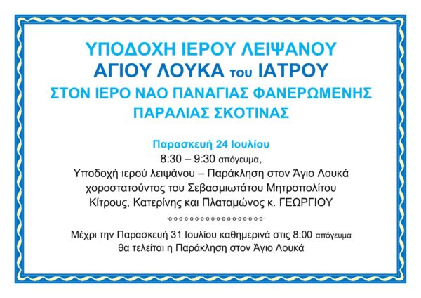 Ιερό Λείψανο του Αγίου Λουκά του Ιατρού υποδέχεται ο Ιερός Ναός Παναγίας Φαναερωμένης Παραλίας Σκοτίνας, κατά την Παρακσευή 24 Ιουλίου 2020, χοροσταντούντος του Σεβασμιωτάτου Μητροπολίτου Κίτρους, Κατερίνης και Πλαταμώνος κ. Γεωργίου.