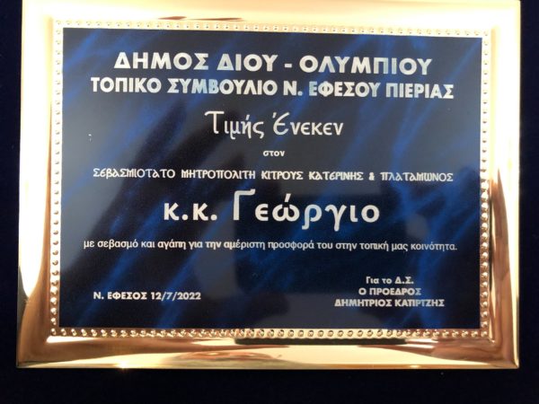 Στο πλαίσιο των εορταστικών εκδηλώσεων του Ιερού Ναού Αγίου Παϊσίου Νέας Εφέσου με αφορμή την Εορτή του Νεοφανούς Αγίου, το Τοπικό Συμβούλιο της Νέας Εφέσου τίμησε, κατόπιν ομόφωνης απόφασής του, τον Σεβασμιώτατο Μητροπολίτη Κίτρους, Κατερίνης και Πλαταμώνος κ. Γεώργιο.