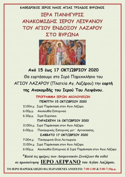 Ιερά Πανήγυρη για την ανακομιδή του Ιερού Λειψάνου του Αγίου Λαζάρου στο Βύρωνα θα πραγματοποιηθεί στο Ιερό Παρεκκλήσιο του Αγίου Λαζάρου στην ομώνυμη πλατεία του Βύρωνα από σήμερα έως και την ίδια την ημέρα της εορτής, ήτοι το Σάββατο 17 Οκτωβρίου. Σήμερα το πρωί εψάλη Ιερά Παράκληση στον Άγιο Λάζαρο, ενώ στις 6 το απόγευμα θα τελεστεί η Ακολουθία του Εσπερινού κι έπειτα του Ιερού Ευχελαίου.