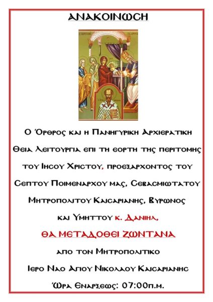 Στις 7.00 το πρωί θα αρχίσει ο Όρθρος πριν την Πανηγυρική Θεία Λειτουργία επί τη εορτή της περιτομής του Ιησού Χριστού στον Ιερό Ναό Αγίου Νικολάου Καισαριανής, προεξάρχοντος του Σεβασμιωτάτου Μητροπολίτου Καισαριανής, Βύρωνος και Υμηττού κ. Δανιήλ. Εκ της Ιεράς Μητροπόλεως σημειώνεται ότι θα μεταδοθεί και ζωντανά για όσους δεν μπορέσουν να παραστούν.