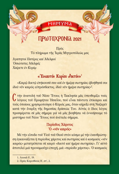 Κατά τη διάρκεια της Θείας Λειτουργίας θα διαβαστεί και η ποιμαντορική εγκύκλιος του Σεβασμιωτάτου για την έλευση του νέου έτους, όπου αναφέρεται στον χρόνο, όπως αυτός άλλαξε για τον άνθρωπο με την ενανθρώπηση του Χριστού.