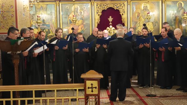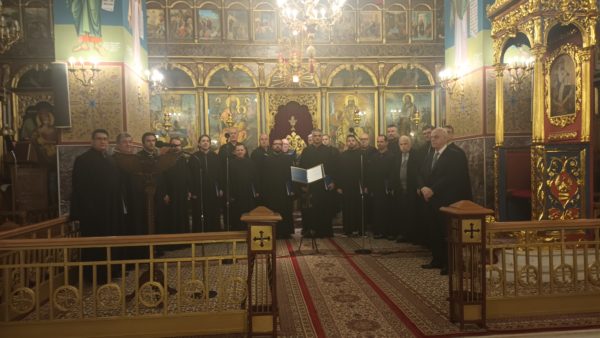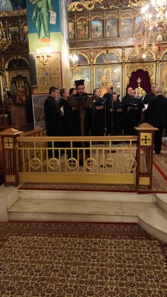 Τους ύμνους της εορτής των Χριστουγέννων απέδωσαν με τις μελωδικές τους φωνές οι ιεροψάλτες του Συλλόγου Ιεροψαλτών Αιγιαλείας 1918 «Ιωάννης ο Κουκουζέλης» υπό τη διεύθυνση του Χοράρχου κ. Φωτίου Θεοδωρακόπουλου.