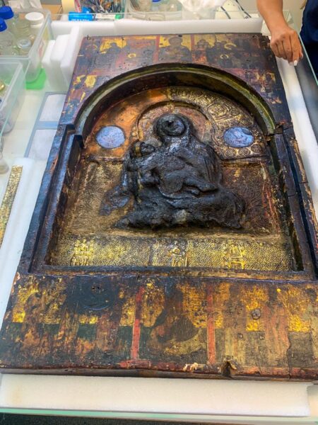 Η κα Αλεξοπούλου ενημέρωσε τον κ. Ιερώνυμο για την πρόσφατη επίσκεψή της στα εργαστήρια συντήρησης του Υπουργείου Πολιτισμού και Αθλητισμού, όπου πραγματοποιείται η αποκατάσταση της Ιερής Εικόνας της «Παναγίας της Μεγαλοσπηλαιώτισσας».