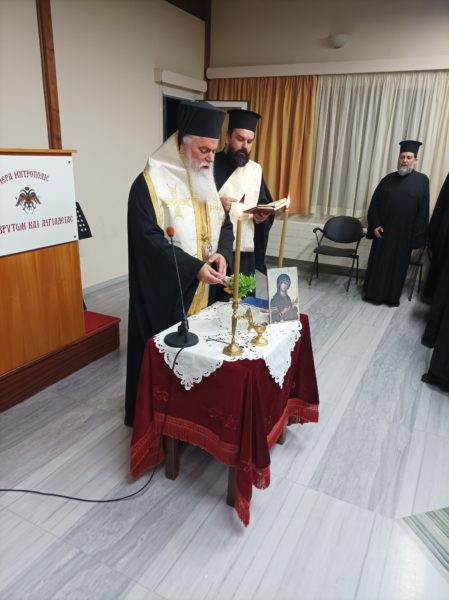 Την Ακολουθία του Αγιασμού τέλεσε ο Σεβασμιώτατος, ο οποίος στο τέλος ευχήθηκε πατρικά στους παρευρισκομένους ακροατές για μία γόνιμη, πνευματικά ωφέλιμη και δημιουργική χρονιά, με στόχο να εδραιωθεί στις ψυχές μας ο λόγος του Κυρίου και να δώσει τους ευλογημένους καρπούς του στην καθημερινή μας ζωή και στις σχέσεις μας με τον συνάνθρωπο.