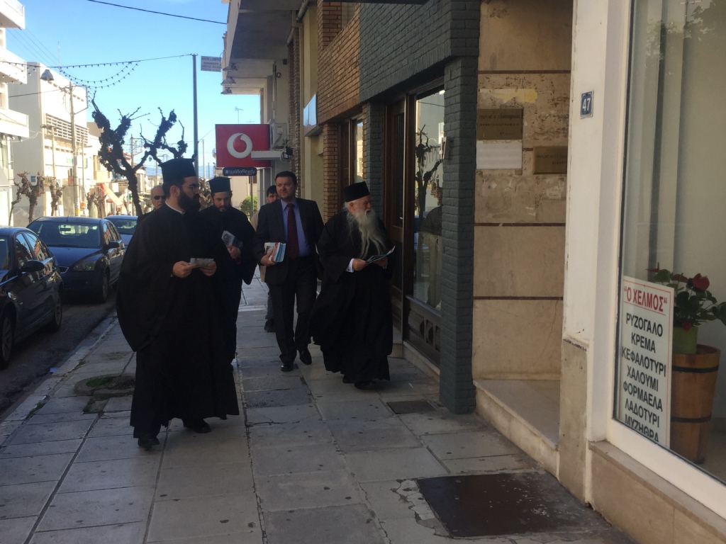 Ολοκληρώνοντας κάλεσε το εκκλησίασμα να ψάλλει τον εθνικό μας ύμνο και στη συνέχεια όλοι μαζί τραγούδησαν το «Μακεδονία ξακουστή», βροντοφωνάζοντας «Ζήτω η Ελλάδα», «Ζήτω η Ορθοδοξία» και «Η Μακεδονία ήταν και θα παραμείνει ελληνική»! Αμέσως μετά ο Σεβασμιώτατος επέλεξε έναν ξεχωριστό τρόπο να τιμήσει τη μεγάλη αυτή ημέρα του Χριστιανισμού. Πιο συγκεκριμένα, θέλοντας να δείξει την έντονη ανησυχία και αγωνία του για τον πόλεμο που δέχεται η Ορθοδοξία, βρέθηκε στην οδό Μητροπόλεως και στην πλατεία Υψηλών Αλωνίων προκειμένου να διανείμει ο ίδιος φυλλάδια με τίτλο «Οι παραδόσεις μας ποδοπατούνται. Η Εκκλησία της Ελλάδος ευρίσκεται πλέον εν διωγμώ», τα οποία αναφέρονταν στην τροποποίηση του άρθρου 3 του Συντάγματος που κάνει λόγο για ουδετερόθρησκο κράτος. Ο Σεβασμιώτατος επισκέφθηκε καταστήματα και καφετέριες, όπου συζήτησε με τους παρευρισκόμενους (άτομα κάθε ηλικίας), η πλειοψηφία των οποίων επικρότησαν τη συγκεκριμένη πρωτοβουλία του, προτρέποντάς τον μάλιστα να συνεχίσει το ποιμαντικό του έργο με τον ίδιο δυναμισμό και παρρησία που τον διακρίνουν.