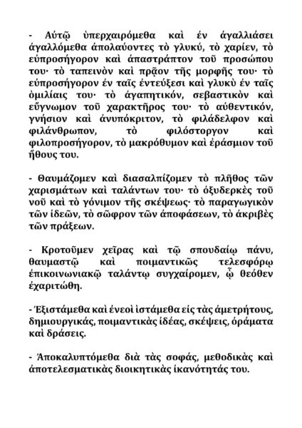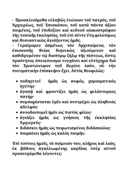 Ἐπὶ τούτοις ἡμεῖς, τὸ ποίμνιόν του, κλῆρος καὶ λαός, ἐκ βάθους ἀγαλλιωμένης καρδίας ὑπὲρ αὐτοῦ προσευχόμεθα λέγοντες: