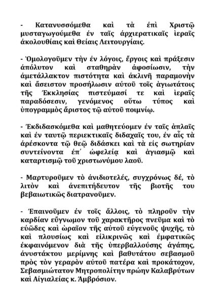 – Ὁμολογοῦμεν τὴν ἐν λόγοις, ἔργοις καὶ πράξεσιν ἀπόλυτον καὶ σταθηρὰν ἀφοσίωσιν, τὴν ἀμετάλλακτον πιστότητα καὶ ἀκλινῆ παραμονὴν καὶ ἄσειστον προσήλωσιν αὐτοῦ τοῖς ἁγιωτάτοις τῆς Ἐκκλησίας πιστεύμασί τε καὶ ἱεραῖς παραδόσεσιν, γενόμενος οὕτω τύπος καὶ ὑπογραμμὸς ἄριστος τῷ αὐτοῦ ποιμνίῳ.