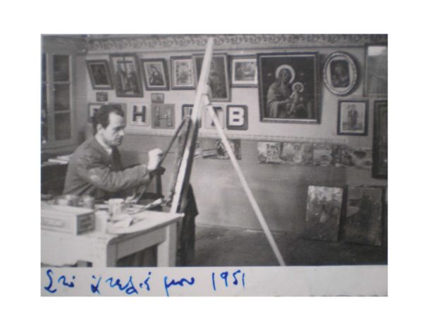 Φωτογραφία – Ο Ανδρέας Δάλλας το έτος 1951 σε ηλικία τριανταπέντε ετών μπροστά στο καβαλέτο του απορροφημένος στο έργο του στο χώρο του εργαστηρίου του της οδού Πετμεζά, σε φωτογραφία που φέρει ιδιόγραφο σημείωση και χρονολόγηση. «Από μικρός είχε μανία με τις μπογιές και τα πινέλα. Ξεκίνησε σαν επιγραφοποιός για να εξελιχθεί σε ζωγράφο. Το ατελιέ του ήταν στην οδό Πετμεζά. Όλη μέρα ο Ανδρέας ζωγράφιζε, τοπία, πρόσωπα, αγίους, πνιγμένος σε χρώματα και μουσαμάδες». Με τα λόγια αυτά μνημονεύει το ζωγράφο ο λογοτέχνης και δημοσιογράφος Κώστας Ριζόπουλος σε εξόδιο κείμενό του, δημοσιευμένο λίγες μέρες μετά το θάνατο του ζωγράφου στο Βήμα της Αιγιάλειας. Το εργαστήριό του υπήρξε τόπος συνάντησης και επικοινωνίας των αιγιωτών της εποχής. Λειτουργούσε και ως μόνιμος εκθεσιακός χώρος των έργων του. Ήταν πάντοτε γεμάτος, από το ταβάνι μέχρι το πάτωμα, με κάθε είδους πίνακά του. Στο βάθος της φωτογραφίας στο μέσον του τοίχου, διακρίνονται διάφοροι τύποι γραμμάτων με ερριμμένες σκιές, που χρησίμευαν σαν δείγματα για τις επιγραφές που φιλοτεχνούσε. Ανάμεσα στα έργα του αναγνωρίζουμε τις Εικόνες της Αγωνίας, των Αγίων Κωνσταντίνου και Ελένης και της Αγίας Βαρβάρας, αντίγραφα του Δάλλα από γνωστές λιθογραφίες της εποχής. Η μεγαλύτερων διαστάσεων Βρεφοκρατούσα σε προτομή στα δεξιά της φωτογραφίας, είναι πιστό αντίγραφο του ζωγράφου από ολόσωμη Εικόνα της Θεοτόκου του Αθανασίου Σταθακόπουλου που βρίσκεται στον Κοιμητηριακό Ναό του Αγίου Γεωργίου στο Λόγγο. Στο κάτω δεξιό μέρος ακουμπισμένες στο πάτωμα διακρίνονται δύο παλαιές αυθεντικές Εικόνες. Στα αριστερά οι Άγιοι Πέτρος και Παύλος, έργο του Δημητρίου Φανέλλη και δεξιά ο Άγιος Δημήτριος, έργο του Γιαννίκου Αρμινόπουλου ή Σμυρναίου. Φθαρμένες Εικόνες που εντοπίζονταν τα χρόνια εκείνα στους παλαιούς Ναούς του Αιγίου από Εφημερίους και Εκκλησιαστικά Συμβούλια, κατέληγαν συχνά στο εργαστήριο του Ανδρέα Δάλλα προκειμένου ο ζωγράφος να Τις στερεώσει και να Τις καθαρίσει, κατά την αντίληψή του.
