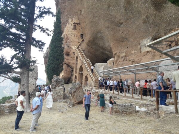 Στο Ησυχαστήριο του Οσίου Λεοντίου, Παλαιομονάστηρο, βρέθηκαν σήμερα πιστοί από την Αιγιαλεία, την Αχαΐα και την Κόρινθο για να λάβουν την ευλογία του Οσίου Λεοντίου. Το Ησυχαστήριο υψώνεται λίγες εκατοντάδες μέτρα πιο πάνω από την Ιερά Μονή Παμμεγίστων Ταξιαρχών Αιγίου.